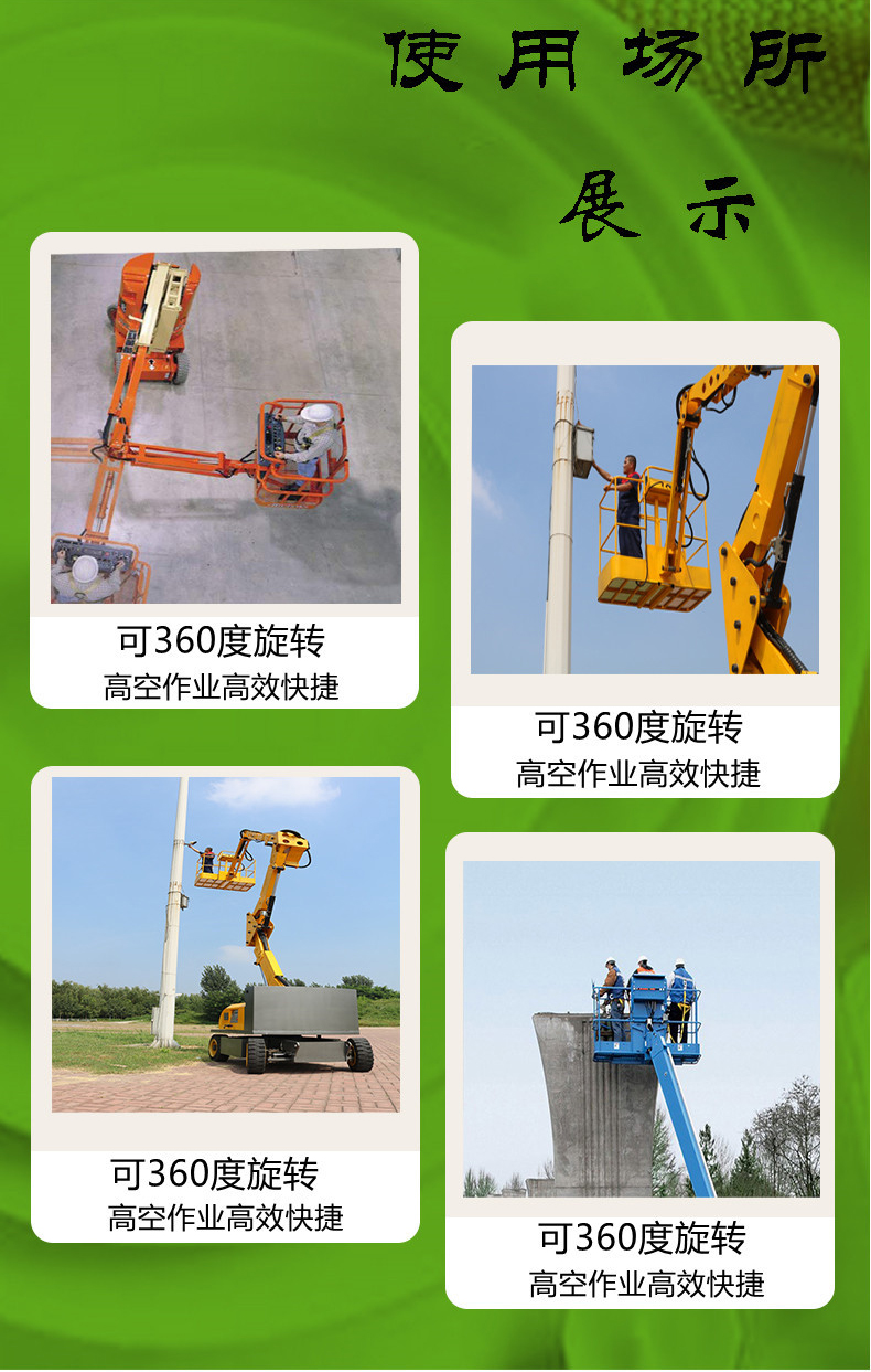 *用途*:曲臂式液壓升降機按照臂展方式可分為直臂和曲臂兩種,多用于船廠等高度要求較高的場所,此類機器安全性較好,移動方便,但是成本很高。 廣泛用于工廠、自動倉庫、停車場、市政、車站、機場、影劇院、展覽館、碼頭、建筑、裝修、物流、電力、交通,石油、化工、酒店、體育館、工礦、企業等的高空作業及維修。是保養機具、油漆裝修、調換燈具、電器、清潔保養等用途的最佳選擇。可根據個人需求使用要求設計制造。 消防隊普遍使用這種升降機。